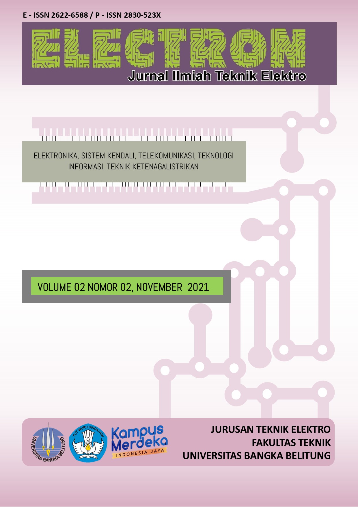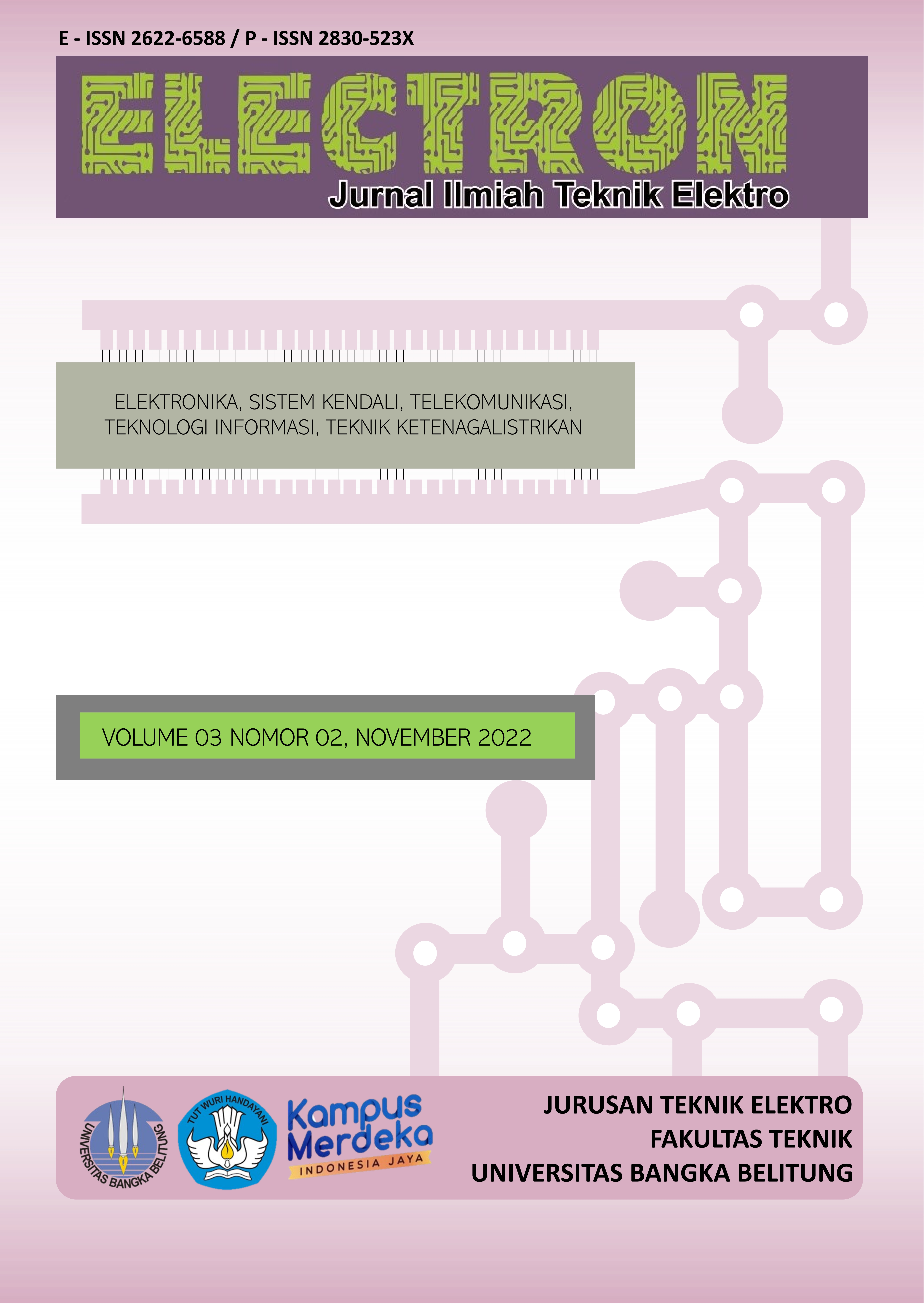 Jurnal Electron Vol 3 No 2, November 2022 start from page 49 to 88 which consist of 5 articles in electrical engineering which include electronic, control, telecommunication, information and technology/informatics, and electricity engineering from several authors which are from both inside and outside the publisher institutions.