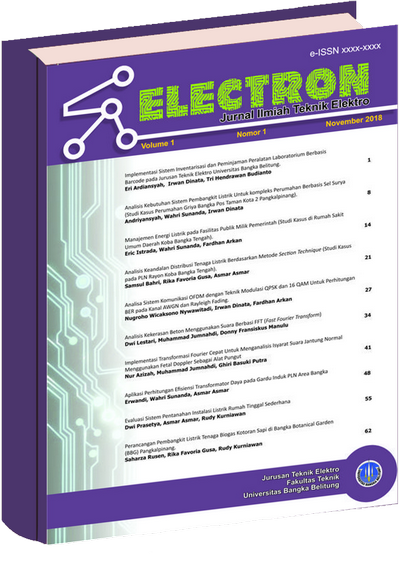 Electron: Jurnal Ilmiah Teknik Elektro is a media for publication and information for scientific papers, undergraduate thesis, research, planning and design concepts, and analysis from students, professors, or any authors concerning various fields of electrical engineering and other related major of studies, including electronic engineering, control engineering, telecommunication, IT and computer sciences, and electrical power engineering. This journal is published twice a year, in May and November. Every article on this e-journal has never been published before in other scientific journals. This E-journal managed by Department of Electrical Engineering, Faculty of Engineering, University of Bangka Belitung